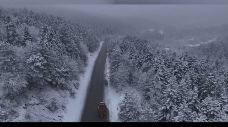 Kar yağışı ve sisin etkili olduğu bölgede oluşan manzara havadan görüntülenirken, Karayolları ekipleri de ulaşımda aksama yaşanmaması için kar küreme ve tuzlama çalışması gerçekleştirdi.