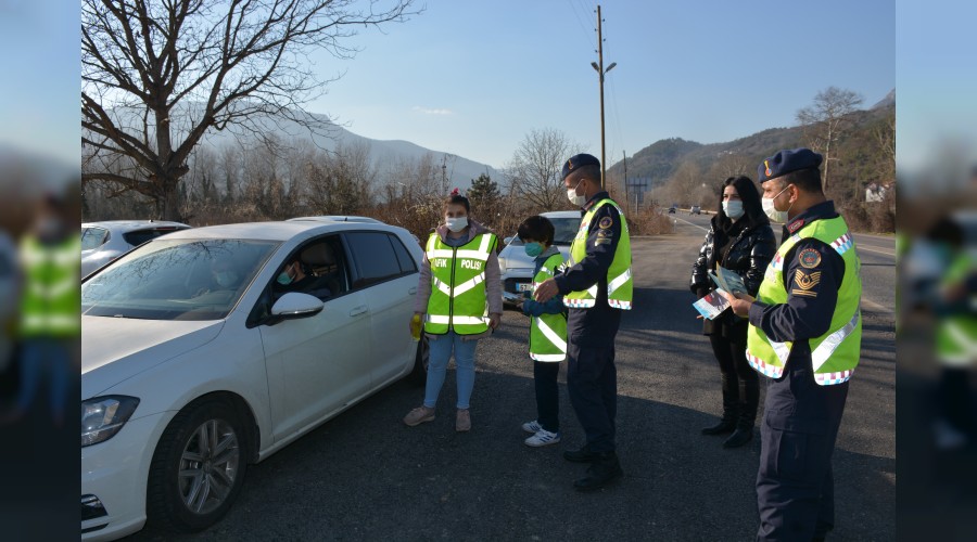 Jandarma ve polis ekipleri ile birlikte Yenice - Zonguldak karayolunda uygulama yapan öğrenciler durdurulan araçlarda bulunan vatandaşlara maske, mesafe ve temizlik kurallarına uymaları konusunda uyarıda bulundular.