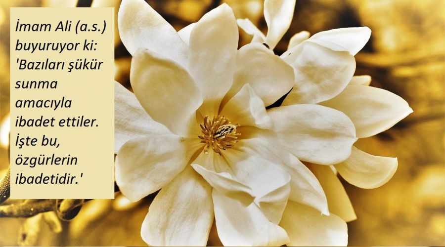 İmam Ali (a.s.) şöyle buyuruyor: "Bazı kimseler birtakım menfaatler umarak Allah'a ibadet ettiler; bu, tüccarların ibadetidir. Bazı kimseler bir şeylerden korktukları için Allah'a ibadet ettiler; bu da kölelerin ibadetidir. Bazı kimseler de teşekkür maksadıyla, şükür sunma amacıyla ibadet ettiler. İşte bu, özgürlerin ibadetidir."